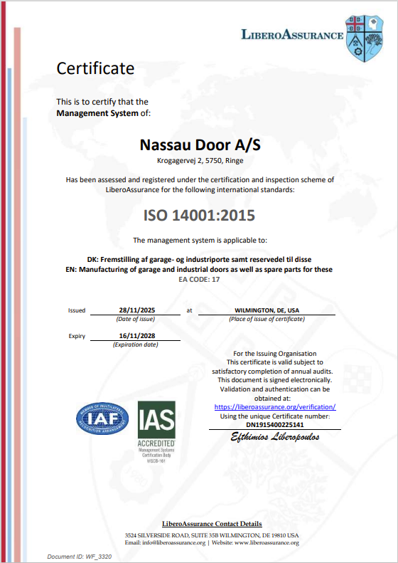 Vi er stolte af at kunne meddele, at NASSAU’s produktion nu er ISO 14001-certificeret – en international standard, der dokumenterer, at vi arbejder systematisk og ansvarligt med vores miljøpåvirkning.
