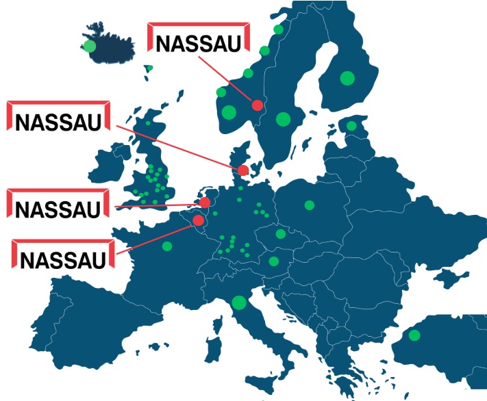NASSAU er stærkt repræsenteret i Europa gennem datterselskaber i Norge, Holland og Belgien. Derudover forhandles NASSAU’s ledhejseporte og garageporte af et netværk af forhandlere i Europas øvrige lande samt i Mellemøsten og Asien.