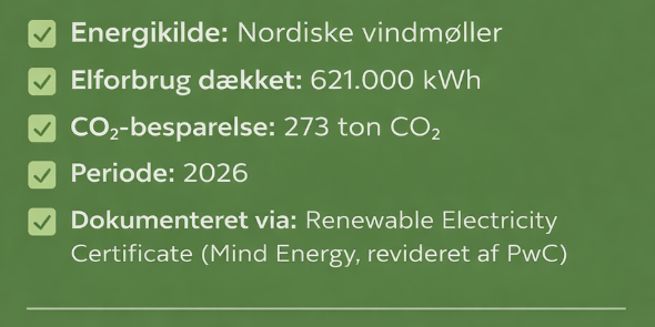 For 2026 svarer dette til 621.000 kWh, hvilket giver mulighed for at rapportere 0 g CO₂ pr. kWh fra elforbrug efter den markedsbaserede metode.
